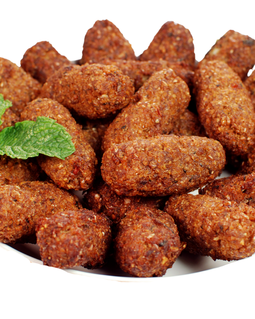 feito de trigo para kibe, carne bovina, cebola, hortelã, alho, óleo sal e especiarias.