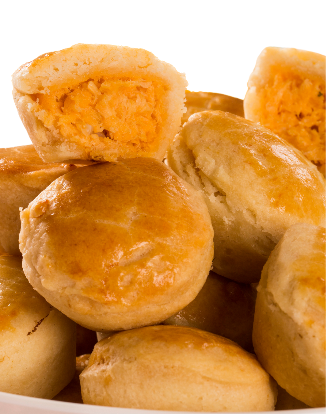 Massa macia e levemente temperada, recheio de frango desfiado com temperos especiais e requeijão cremoso.